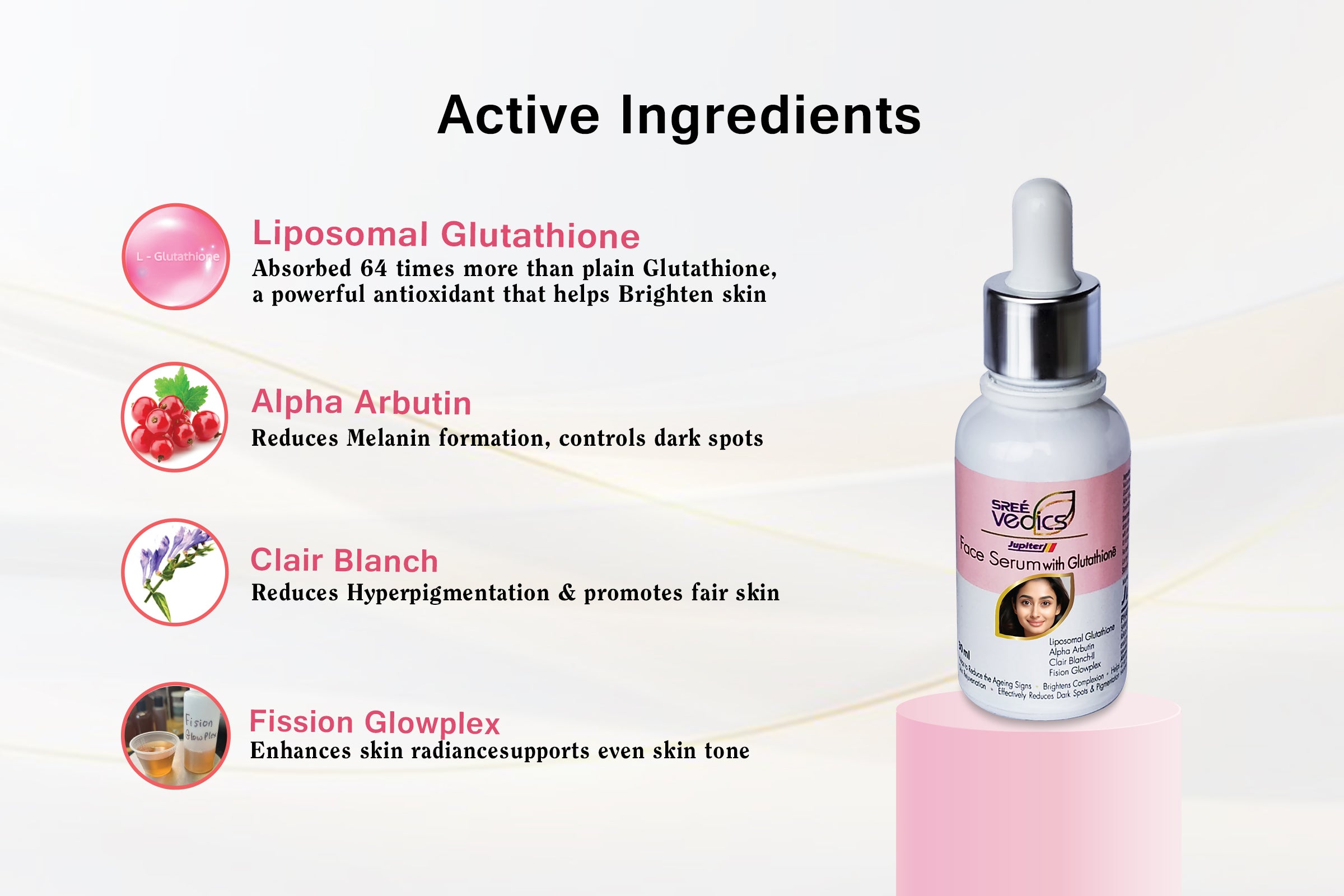 Sree Vedics Brightening Serum is designed to fade dark spots, fight UV damage, and improve skin texture for a radiant, even complexion. Powered by the brilliance of Liposomal Glutathione, it absorbs 64x better than regular Glutathione for faster skin brightening.